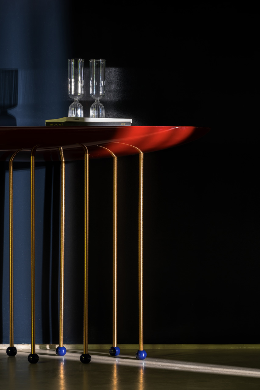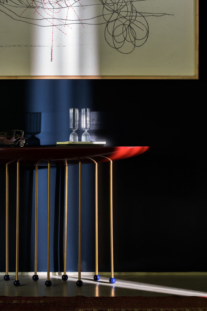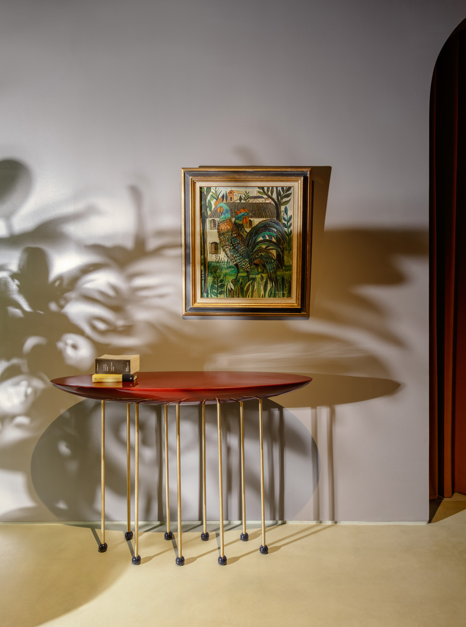 magnificence and refinement. Its wooden top merges seamlessly with the brass legs with